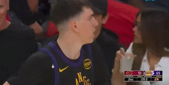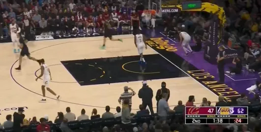 比赛第二节,拉拉维亚强硬杀入禁区,面对阿伦送上单臂隔扣。