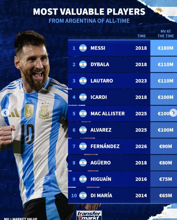 德转统计了阿根廷球员历史身价最高榜。