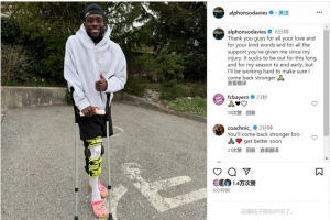 戴维斯在社交媒体上晒出拄拐的照片,配文:“感谢大家给予我的爱和祝福,以及自从我受伤以来对我的支持。缺席这么长时间,以至于我的赛季提前结束,这真的很糟糕,但我会努力恢复,确保自己回归后变得更强大。”